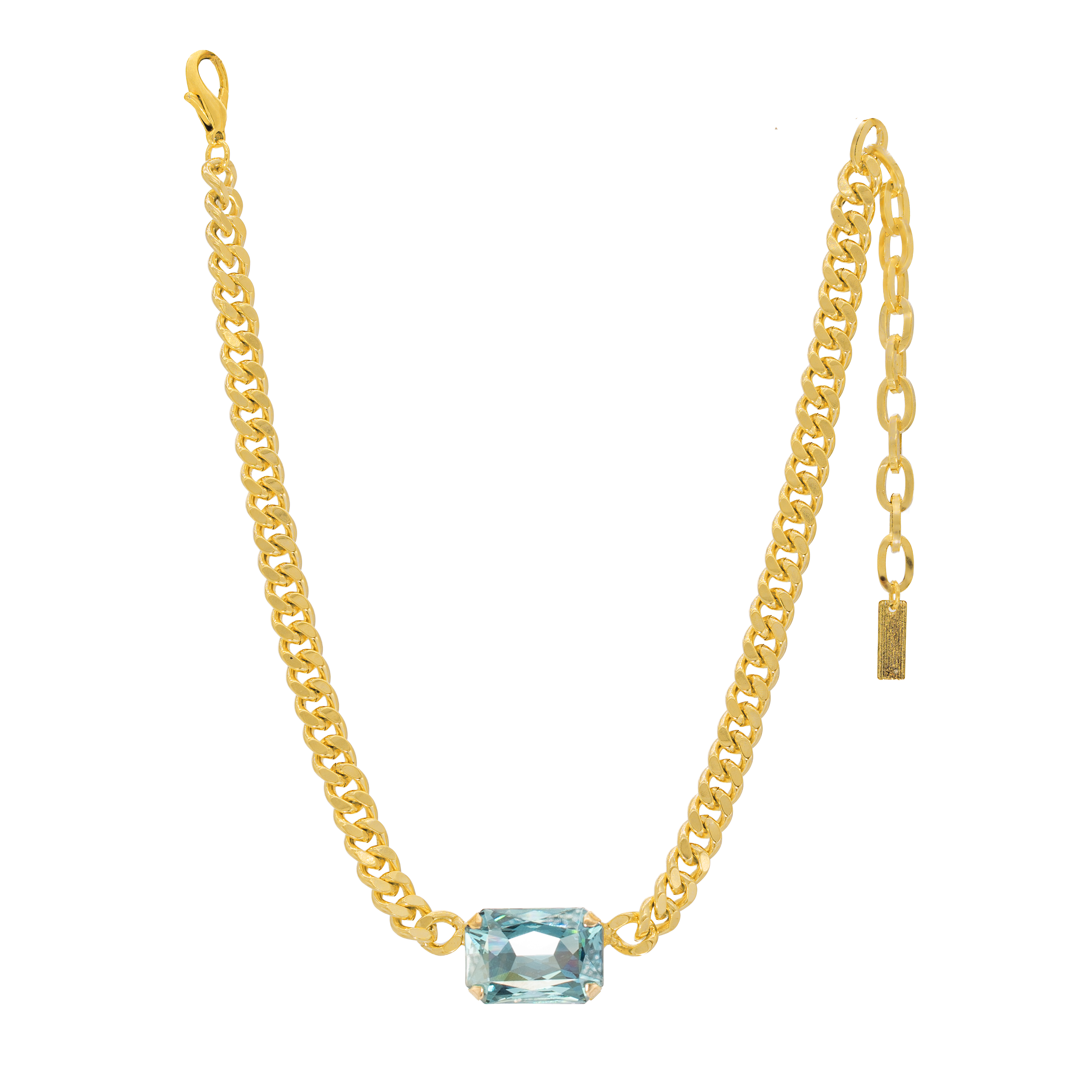 Add a touch of sparkle to your look with the Darcy Necklace in Aqua Champagne. Crafted from antique gold-plated brass and high-quality crystal, this 14" necklace features a 3.5" extender for the perfect fit. Its shimmering design effortlessly brightens any outfit, making it your new favorite statement piece.