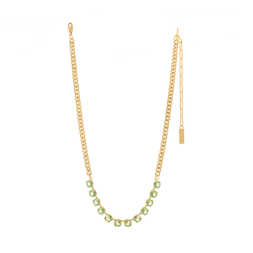 Glimmer and shine in this Mini Oakland in Fairy Dust / Unfoiled! This stunning necklace is gold-plated in brass, and lined with high-quality crystals. Perfect for any occasion, this 13" necklace with a 3" extension has you covered from day to night.