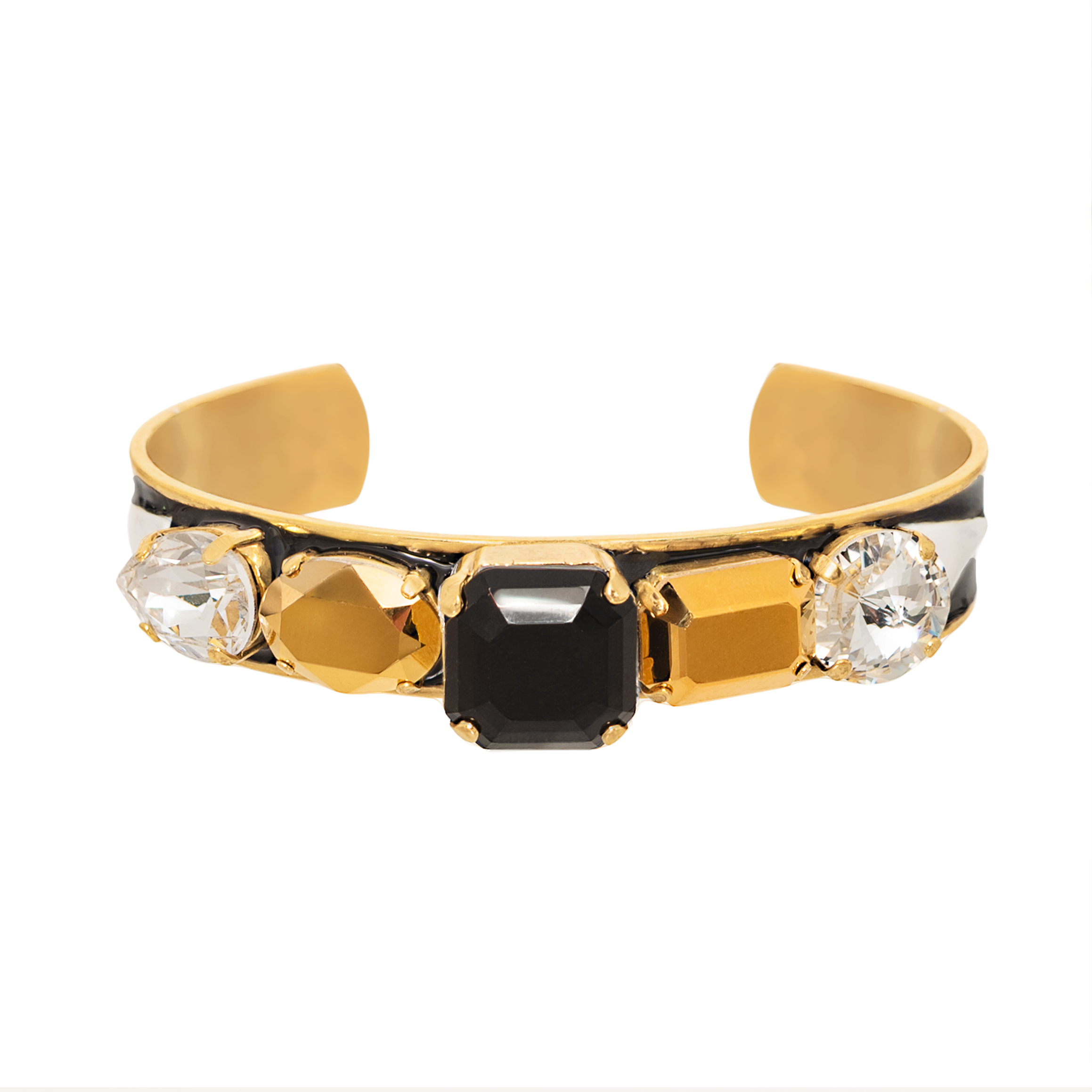 Add a touch of whimsy to your outfit with the Karsten Cuff in Black & White! This antique gold brass bangle is hand painted with colorful enamel, accented by high quality crystals for a touch of sparkle. A playful addition to any jewelry collection.
