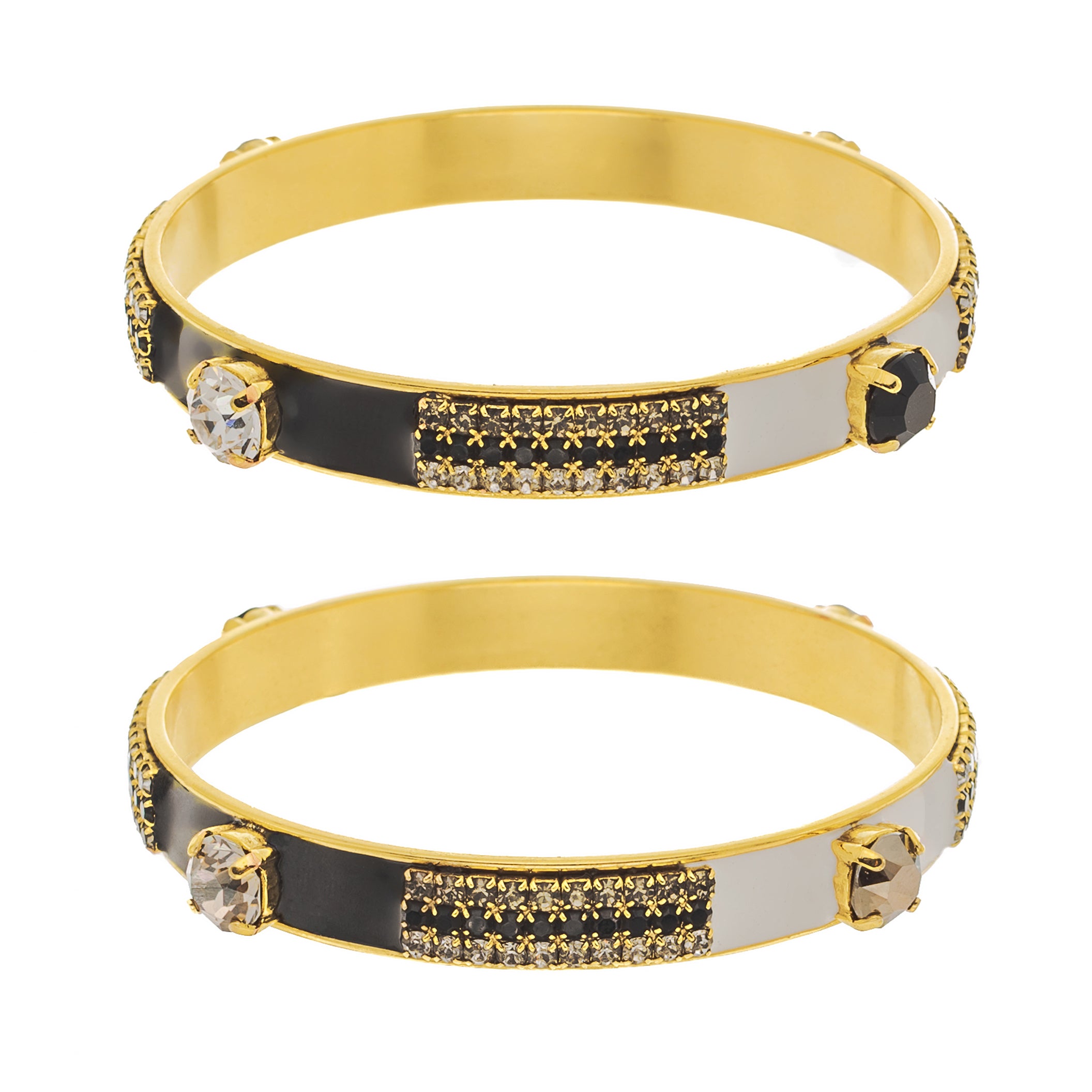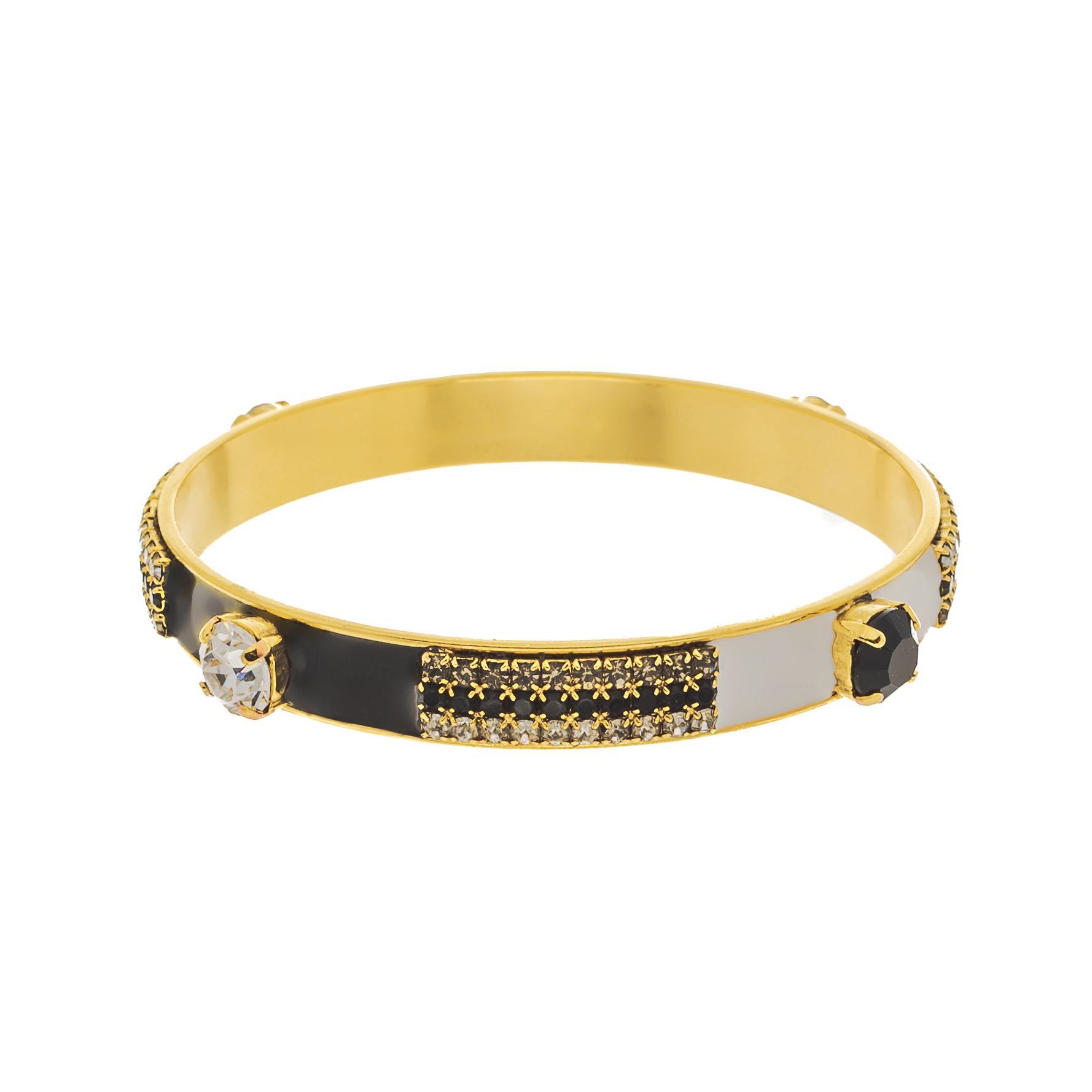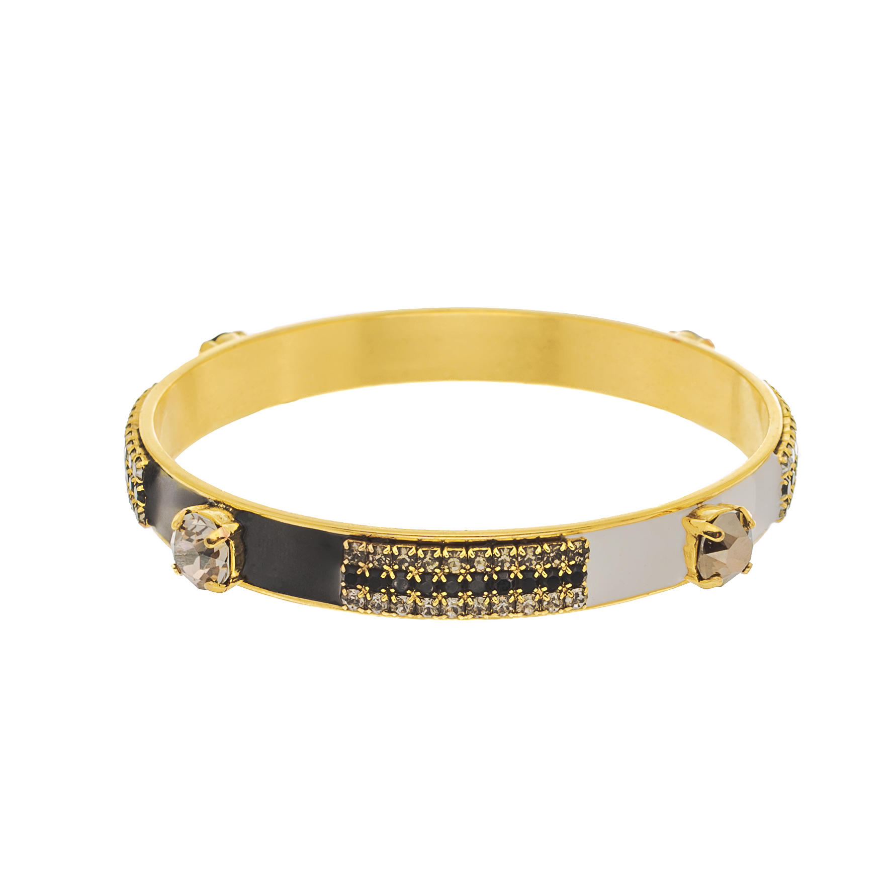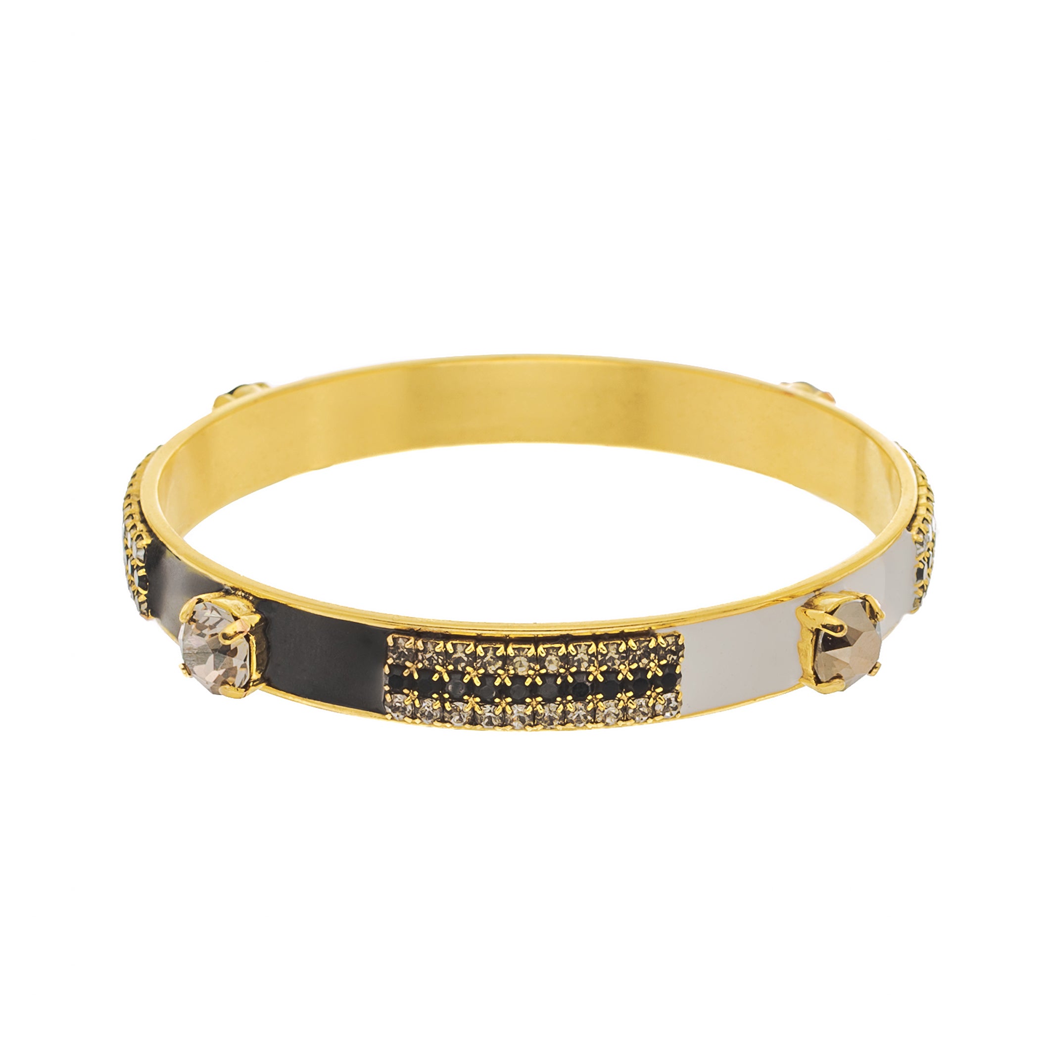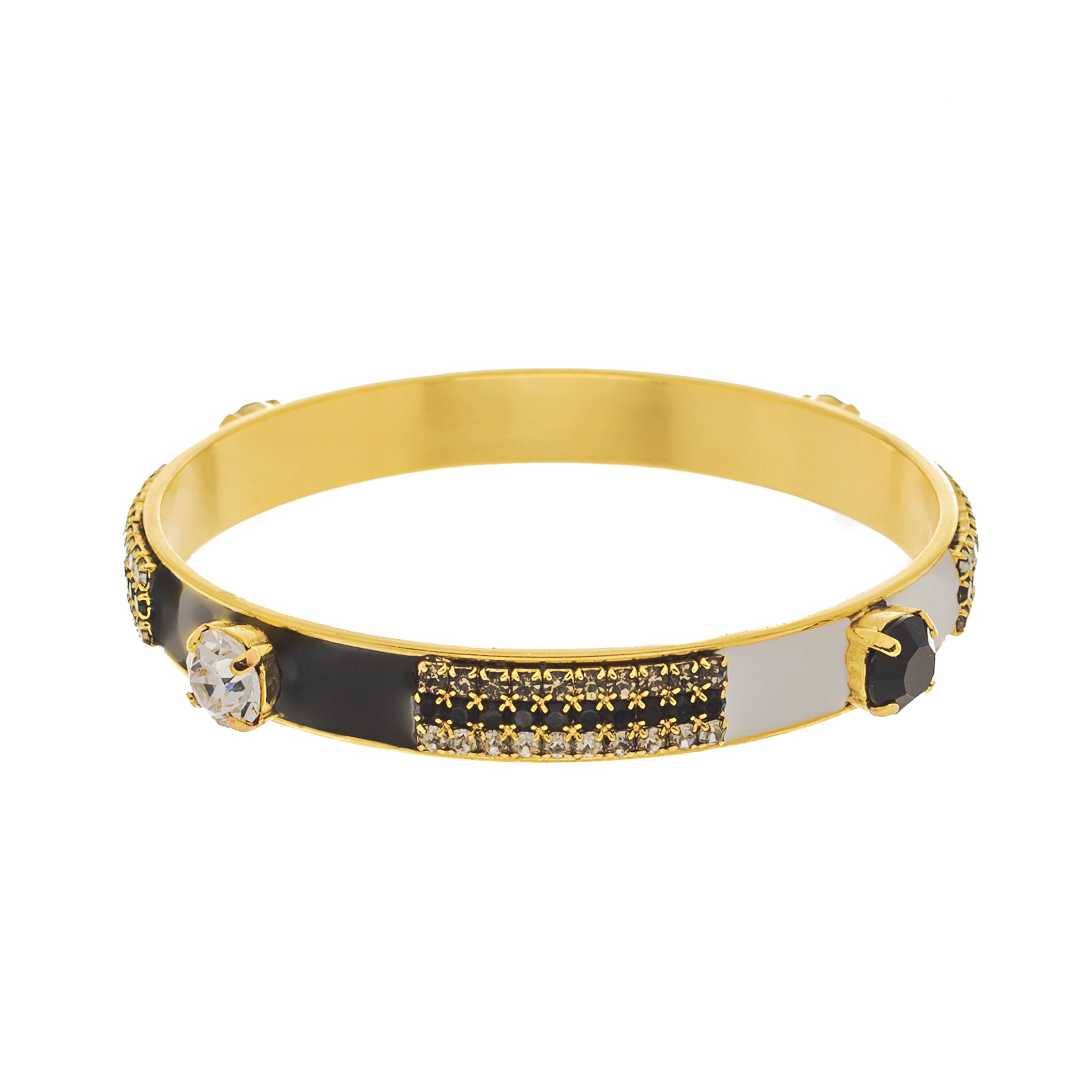 Add a touch of whimsy to your outfit with the Mireya Bangle in Black and White! This antique gold brass bangle is hand painted with colorful enamel, accented by high quality crystals for a touch of sparkle. With an inner circumference of 20 cm, 2.5" inner diameter, this bangle comfortably fits most wrists. A playful addition to any jewelry collection.
