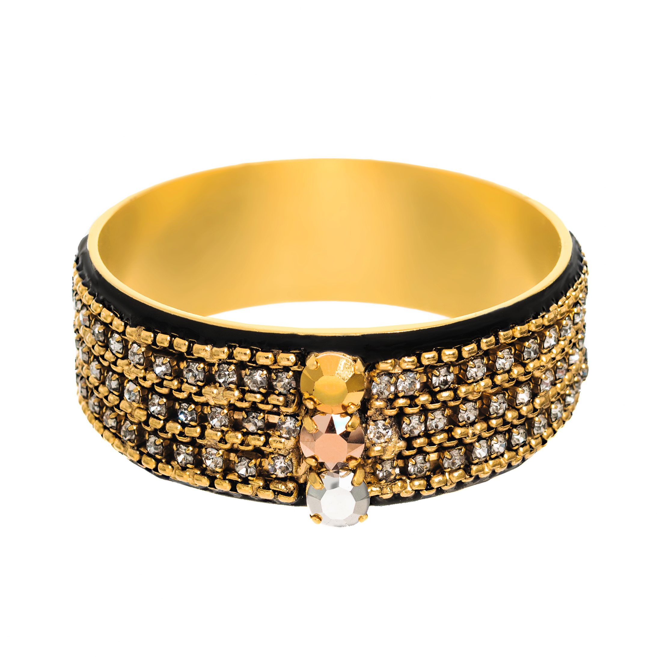 The Kerry Bracelet Large in Black - a playful and unique addition to your accessory collection. Made in Canada with antique gold plated brass, high quality crystals, and hand painted enamel. With an inner circumference of 20 cm, 2.5" inner diameter, this bangle comfortably fits most wrists. This cuff is a one-of-a-kind piece that will add a touch of quirk to any outfit!
