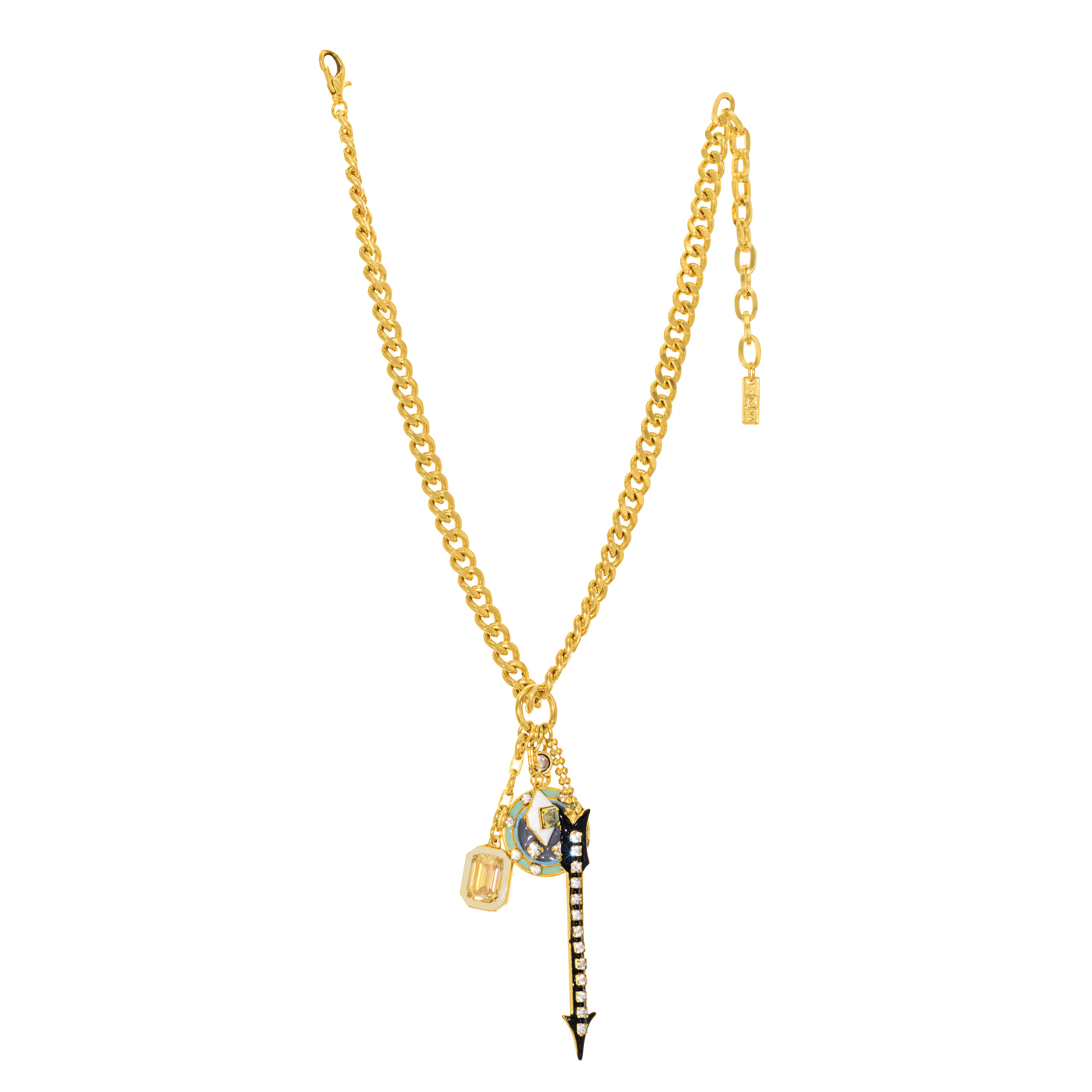 Add a touch of vintage charm with the Baxley Necklace! Crafted from antique gold-plated brass and adorned with sparkling high-quality crystals, this playful piece features hand-painted enamel details. Measuring 16" with a 3" drop and an extra 3" extension, it’s perfect for layering or wearing solo to brighten any outfit.