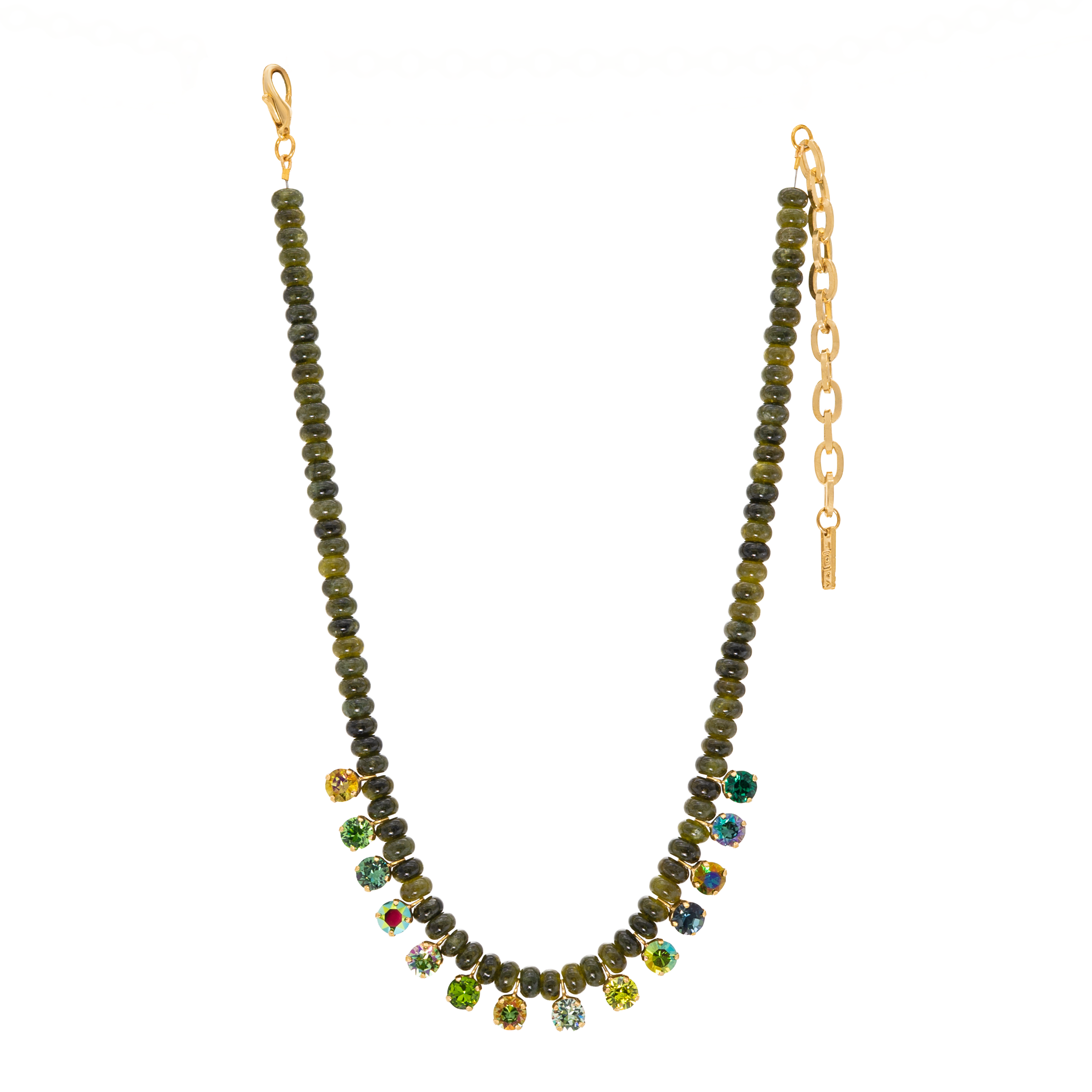 Make a statement with this Bonnie Necklace in Greens! Show off your personality with its antique gold plated brass base metal, high quality crystals and beautiful beads add an extra touch of glam. 17" in length with 3.5" extension. Designed and made in Canada.