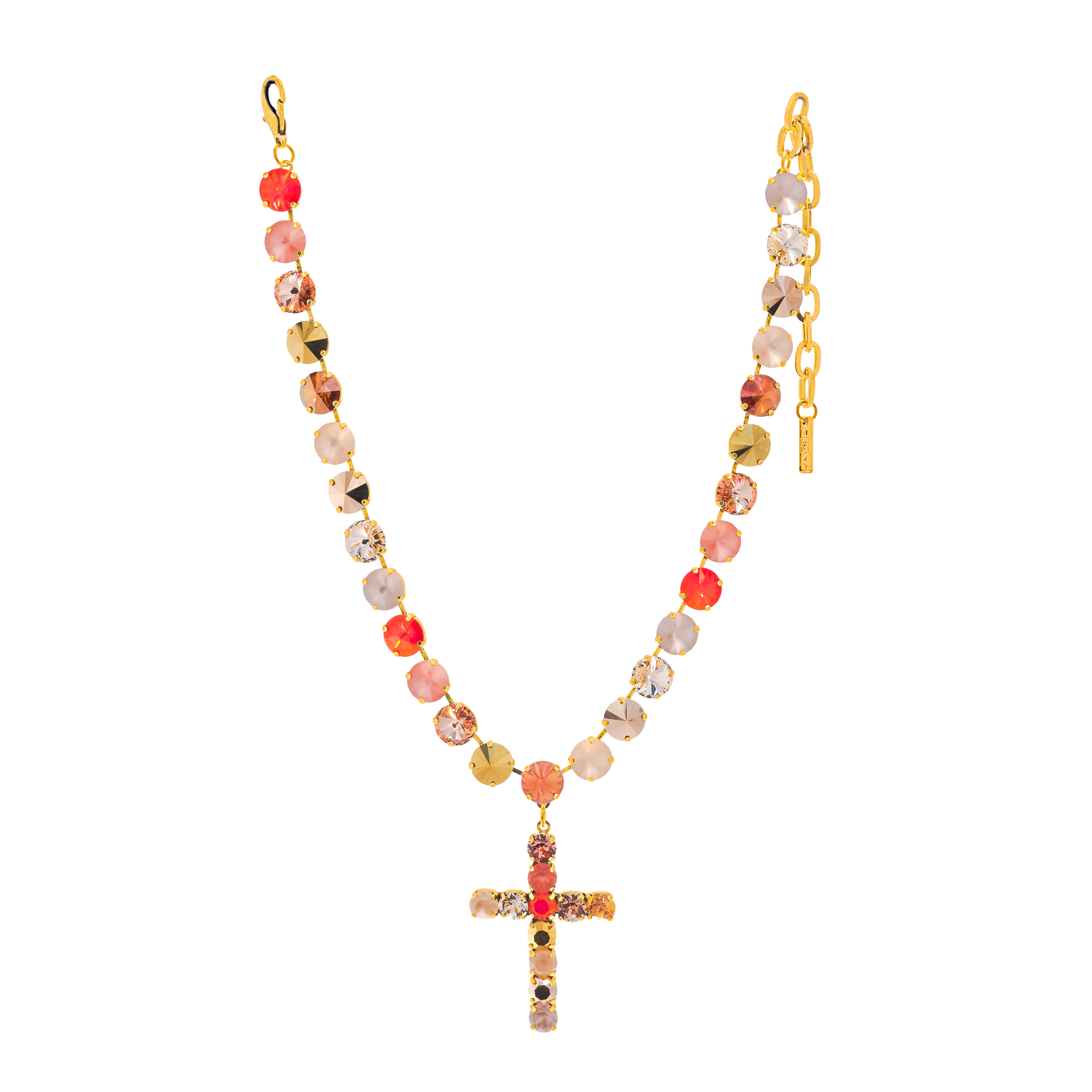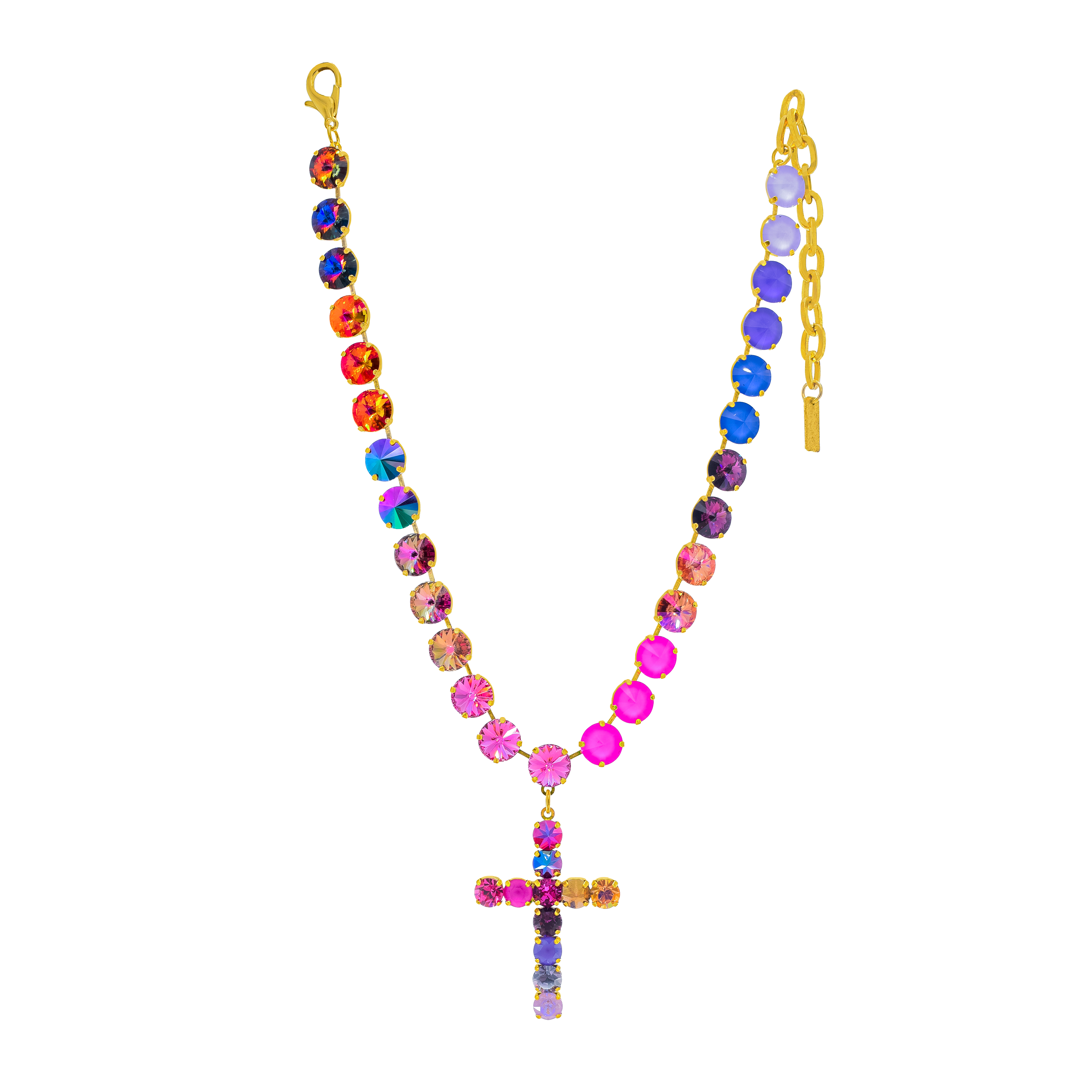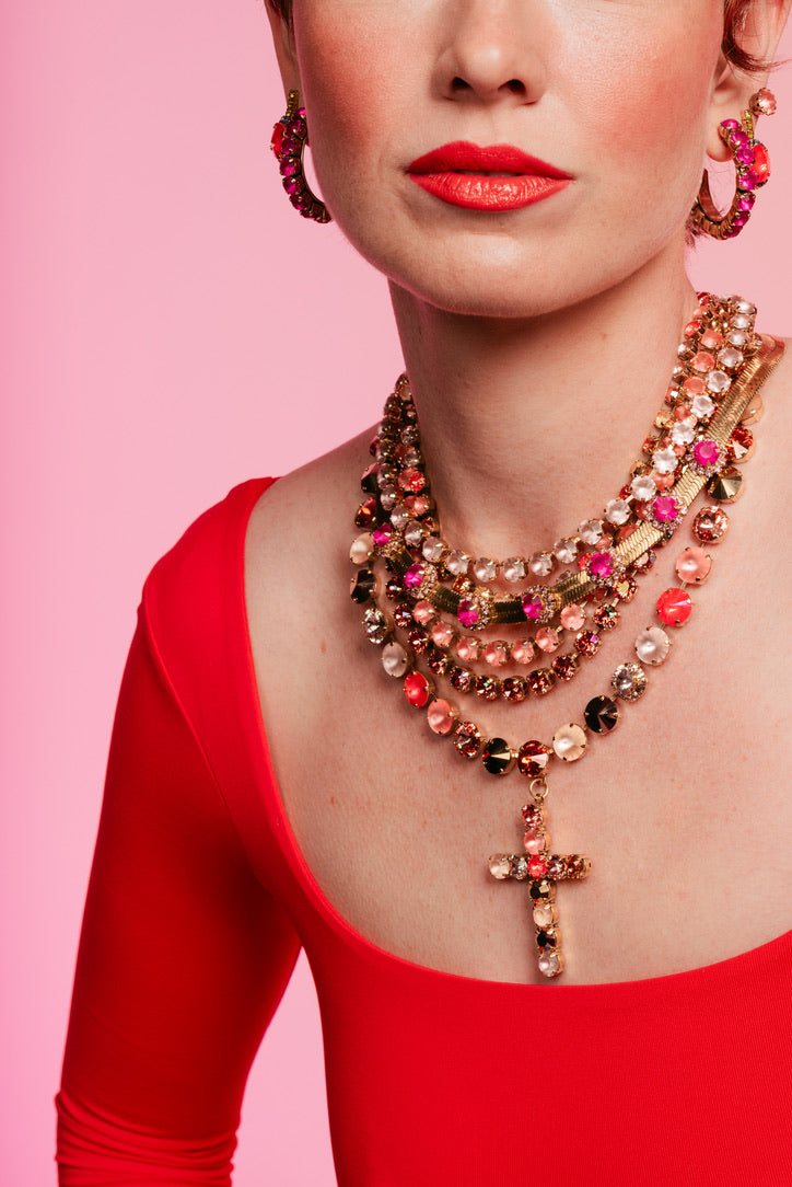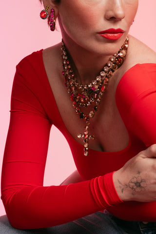 Liven up your look with the Donatella Necklace in Candy Crush! This sparkly stunner will have you turning heads, featuring high quality crystals and an antique gold-plated brass base metal made with love in Canada. Whether you're clinching a big deal or just looking to impress, this beauty's 15" chain and 3" drop will do the trick. Oh la la!